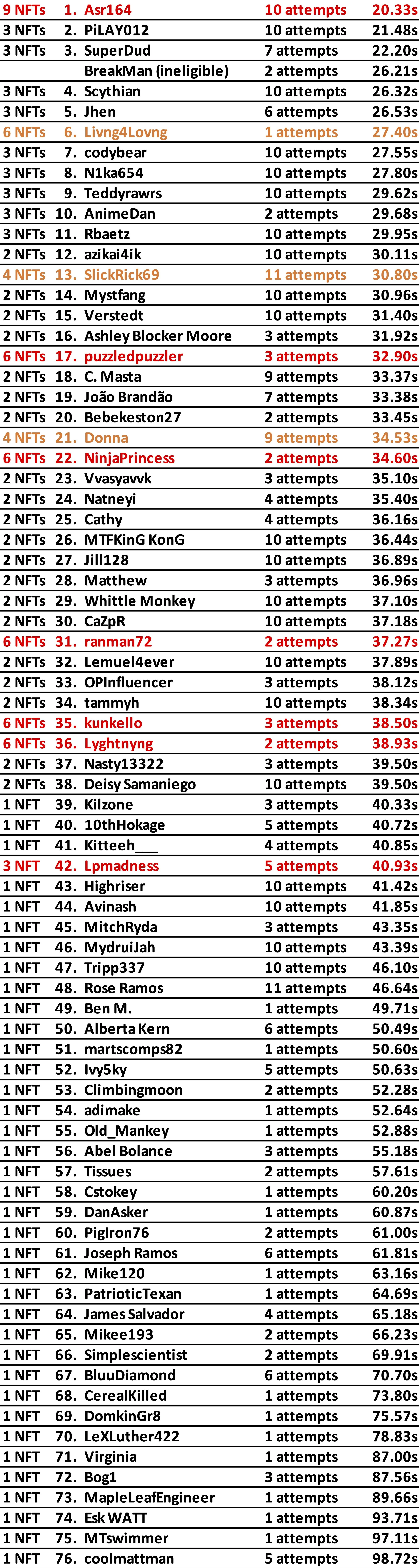 (red names have two “Mythic” Hybrid Creature NFTs w/ 3X multipliers; orange names have one “Mythic” Hybrid Creature NFT w/ 2X multipliers)